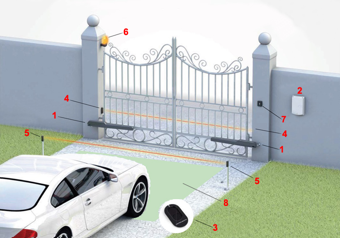 1.Motor 2.Elektronik_Panel 3.Kumanda 4.Fotosel 5.Ayaklı_Fotosel 6.Flaşör 7.Şifreli_Anahtar 8.Manyetik_Araç_Dedektörü