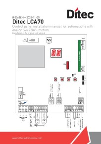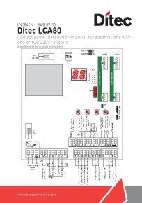 Tanım Ditec TS 35 AC Elektro mekanik motor Geri çevrilemez Maksimum yük (400 Kg x 1.5 m) (300 Kg x 3.5 m) Motor tipi 230 V AC - 50 Hz Enerji tüketimi 1.5 A Çekilen güç 330 W İtme kuvveti 3500 N Açılma süresi 18-22s / 90° Maksimum hareket 400 mm Çalışma sıcaklığı -20°C / +55°C (-35°C / +55°C Donma önleyici sistem NIO etkin) Koruma sınıfı IP 33 Ağırlık 4 Kg Kontrol paneli LCA70 veya LCA80