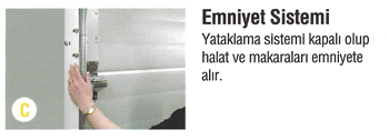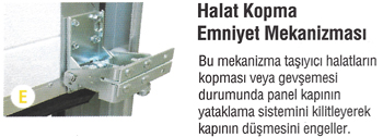 Kapılar manuel motor ve kontrol sistemleri veya manuel palanga sistemi ile çalıştırılabilir. 42 mm kalınlığında saç ve poliüretan dolgulu olan paneller, yangına dayanıklıdır. Kapı çevresinde kullanılan özel contalar sayesinde izolasyonu yüksektir. Kapılar, yürürlükteki imar mevzuatı için gereksinimlerini karşılamaktadır.