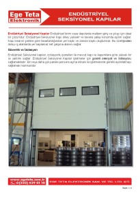 Endüstriyel birim veya depolarda malların giriş ve çıkışı için ideal bir çözümdür. Endüstriyel-Seksiyonel Kapı dikey yükselir ve tavana yatay konumda açılım sağlar. Kapı binanın şekline göre tasarlandığından yer kaybı ve zaman kaybı oluşturmaz. Bu özelliğinden dolayı iç alanlarda yer kaplamaz net çalışma alanını sağlar.